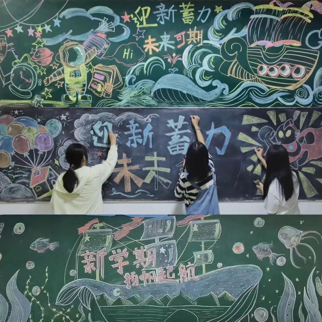 “船帆代表着启航,船身借用鲸鱼外形,画上星辰大海、山川湖泊的景色,寓意着未来有无限可能,前程广阔任君行。”市场营销专业2019级的郭晓宁住在13号寝室楼,看着即将完工的黑板报他连连赞叹,“这样的黑板报能够为寝室楼增添活力,相信新生们一定能感受到学校的温暖与热情。”