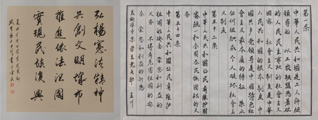 学生党员们通过硬笔书法或软笔书法,采用隶书体、行书体、楷书体三种书体形式将“中华人民共和国是工人阶级领导的、以工农联盟为基础的人民民主专政的社会主义国家”、“中华人民共和国的一切权力属于人民”、“中华人民共和国公民在行使自由和权利的时候,不得损害国家的、社会的、集体的利益和其他公民的合法的自由和权利”等宪法内容和条款落在纸上。本次党日活动共收集书法作品40余份,其中优质书法作品已在色情导航