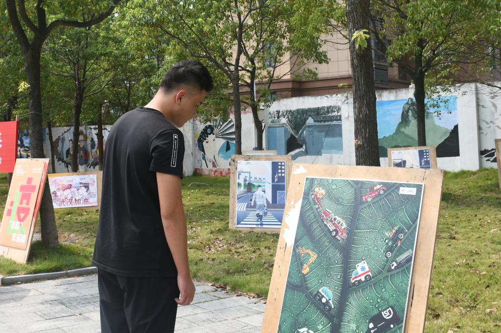 董文慧说,今天第一天开学,在学校保卫处任职的妈妈趁着换班时间带她一起熟悉校园环境时,自己被放在路边的海报作品所吸引。“学长学姐们用专业所学传达着战‘疫’精神,为全民战疫贡献着自己的力量,看到这些作品时我挺有感触的。”她表示,“我会在大学四年认真学习,将来用自己的能力做一个对社会有贡献的人。”