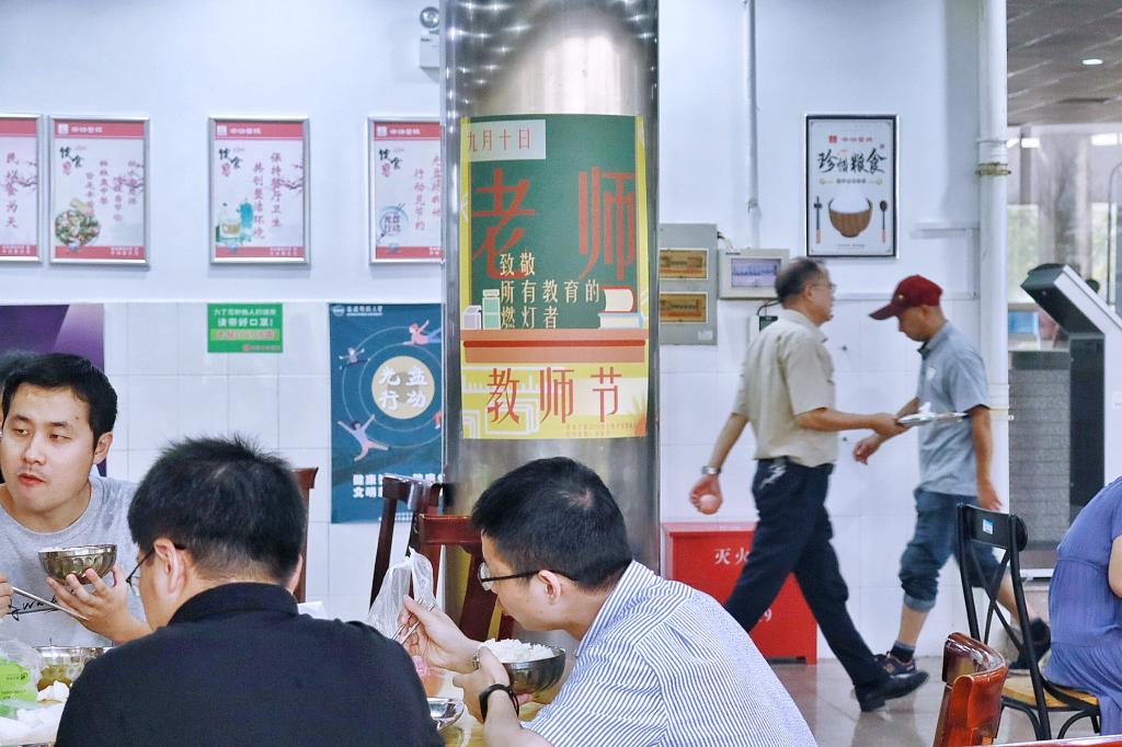 临近中午,有老师陆续陆续来教职工食堂吃饭,张贴的海报作品引得他们纷纷驻足观看,一位女老师还拿出手机拍照分享在了自己的教师群,她笑称:“一进门就注意到了这些海报,食堂都变得更有节日氛围了。今天收到了许多教师节祝福,这样用海报致敬的还是头一份,学生们有心了!”