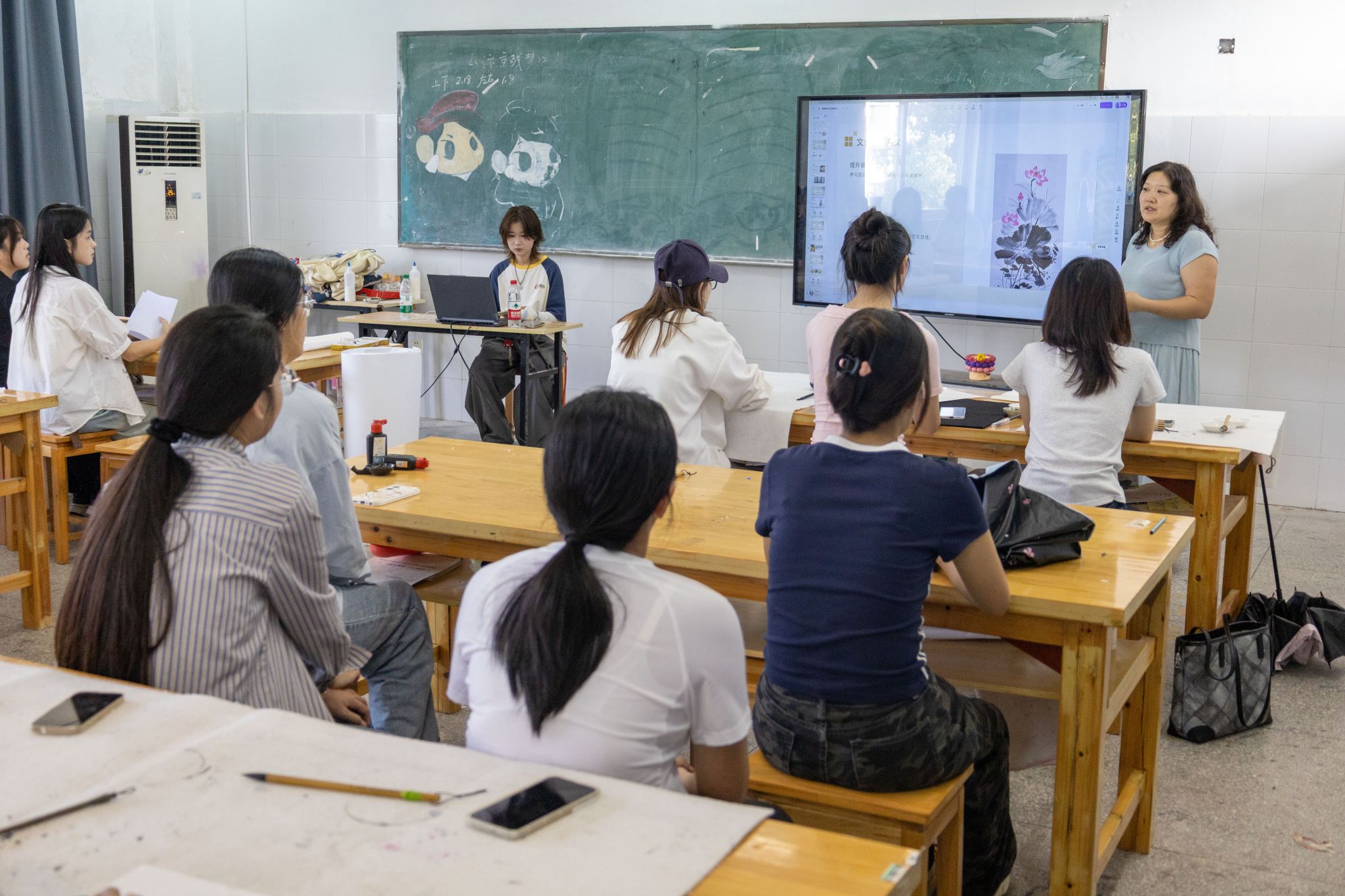 活动现场设置了作品展览区和书画创作区,备齐了宣纸、笔墨和颜料等工具。一方素宣上,亭亭荷花于墨色荷叶间悄然绽放。“我偏爱荷花‘出淤泥而不染,濯清涟而不妖’的风骨,便循着陈石先生的荷花图临摹创作。”美术学专业2024(2)班的邹永清执毫微笑,轻声说。