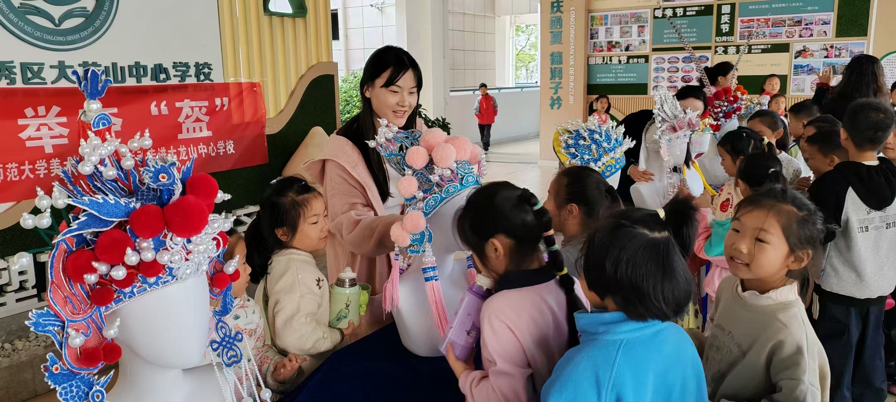 此次活动的“主角”——黄梅戏盔帽,均由美术学(师范)专业的学生在非遗传承人的指导下制作完成。从秀丽雅致的女驸马盔、珠光璀璨的公主凤盔,到威严庄重的九龙盔,每一件作品都还原了传统盔帽的工艺精髓。为适配中小学教学场景,师范生们更对盔帽制作技艺进行了创新转化:将复杂的传统材料替换为安全易操作的粘土、扭扭棒、彩纸等,设计出覆盖小学低、中、高三个学段的课程包——低年级侧重“画盔帽”,用线条色彩勾勒纹样;中年级开展“拼贴半立体盔帽”,培养空间造型能力;高年级尝试“简易盔帽制作”,体验基础工艺流程,实现“非遗技艺”与“课堂教学”的无缝衔接。