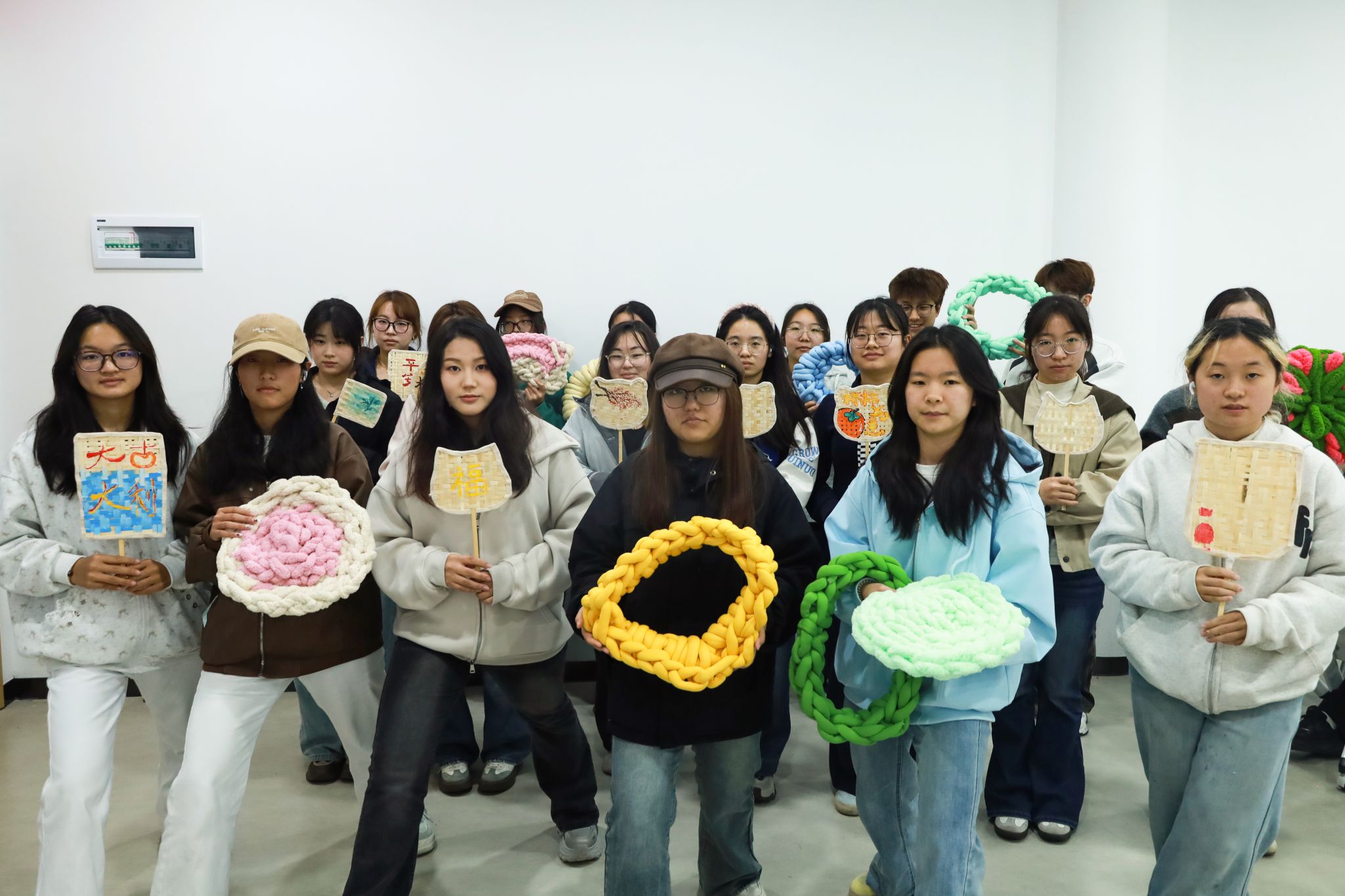 “活结要拉紧,边角才平整。”“配色素雅一点。”“你们编织的手法越来越熟练了!”学校一站式服务中心美育活动室内,“弘美”志愿服务队成员正分头赶制冰岛毛线坐垫靠枕和手绘创意竹编蒲扇,为社区居民准备专属慰问礼品。活动负责人、设计学专业2025(2)班的王晓蕊化身现场“小导师”,通过PPT演示绕圈、打活结、藏线的正确手法,并提醒大家:“我们送给社区老人和劳动者的东西,要朴实、耐用、舒服,不要太潮流花哨,以实用为主。”