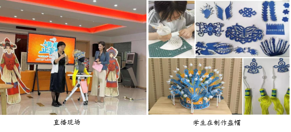 的倪静老师和美术学师范专业的学生展示了他们制作的戏曲盔帽——“五凤凤冠”,并在直播间为线上线下的观众解析制作过程,分享他们在传承黄梅戏地方文化方面的学习成果,获得了在场观众的热烈好评。