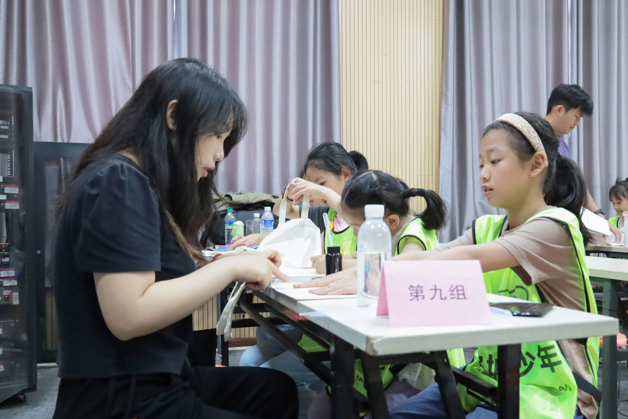 报告厅,一群大学生带着44位小朋友,以树叶为素材,利用蓝晒与拓印技艺,在纯色帆布包上留下了独特的印记。在铁盐与阳光的反应中,树叶的轮廓在帆布包上清晰可见,见证了非遗与青春的碰撞。
