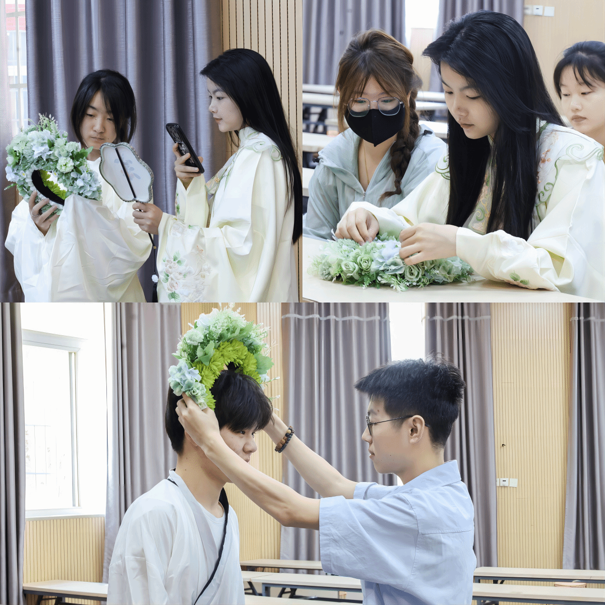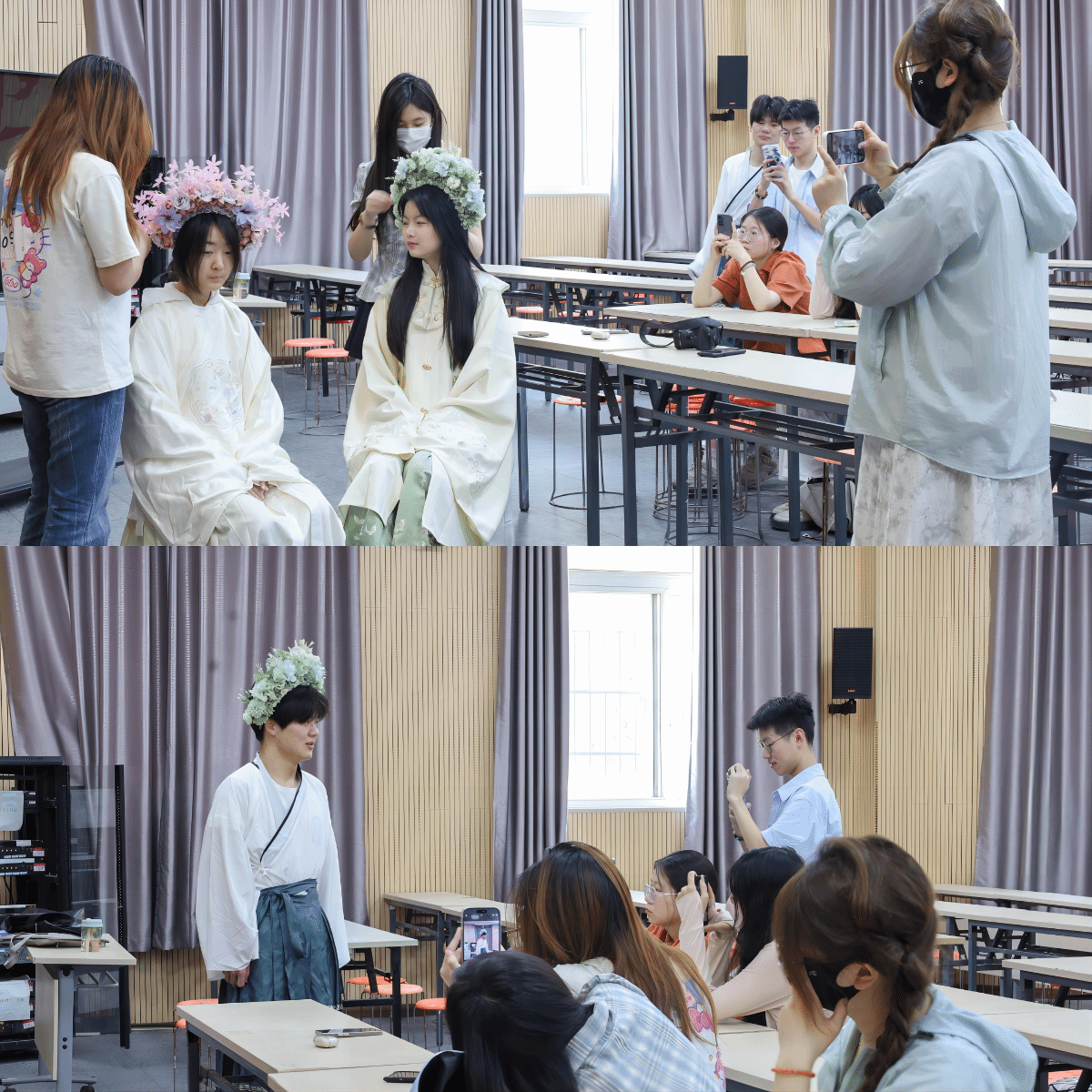 在学院学术报告厅开展“花影绘韵·簪花拾光”活动,学生们在佩戴簪花时领略非遗之美,在更替汉服间体会悠悠古韵。闪光灯闪烁间,学院摄影俱乐部成员用相机为体验者留下“最美”瞬间。