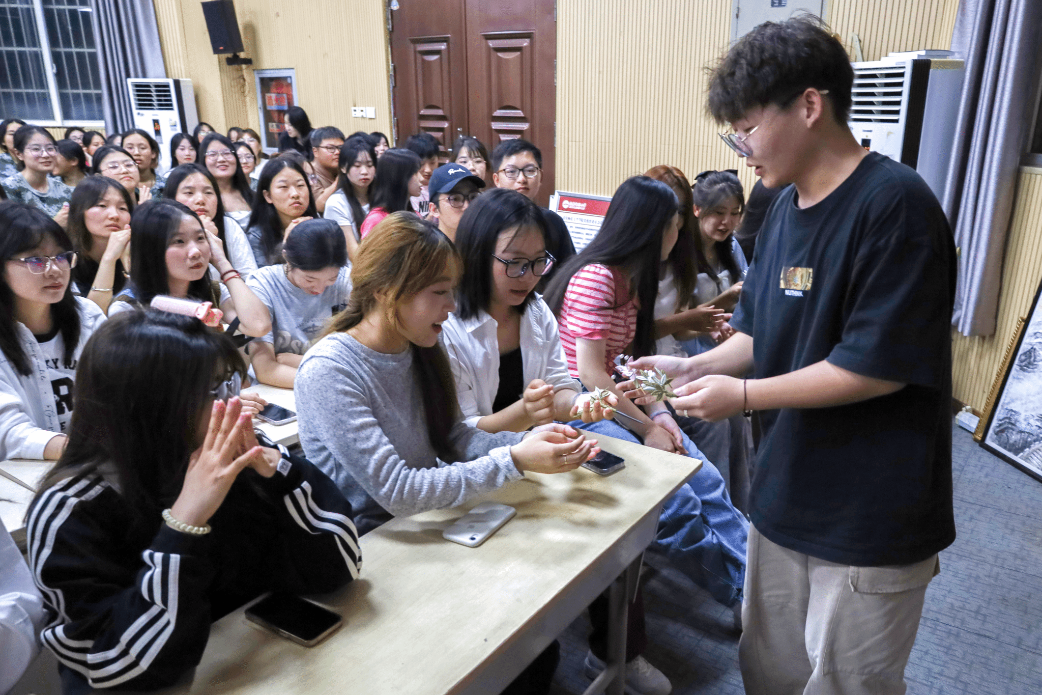 学术报告厅内传来阵阵欢呼声。学院11个俱乐部负责人先后携带作品惊艳“亮相”,面向2023级230名新生开展俱乐部招新宣讲。立体生动的缠花、精美细致的剪纸、豪迈刚劲的书法……各类手工艺品一经展出,就赢得了不少新生的“芳心”。