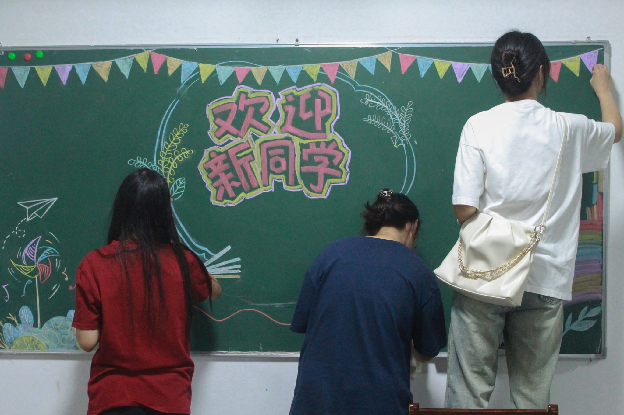 七色粉笔绘出彩虹,在寄语两侧点缀繁花,最后以风车收尾,一幅色彩斑斓的黑板报就出现在8号宿舍楼的黑板上。“彩虹元素代表阳光向上,风车象征着自由。”在班级群看到志愿者招募通知后,视觉传达设计专业2022(2)班的段亚凤便和室友一起报名参与了此次迎新活动。她表示,板报上的寄语和元素都寄托了对新生的美好祝愿。
