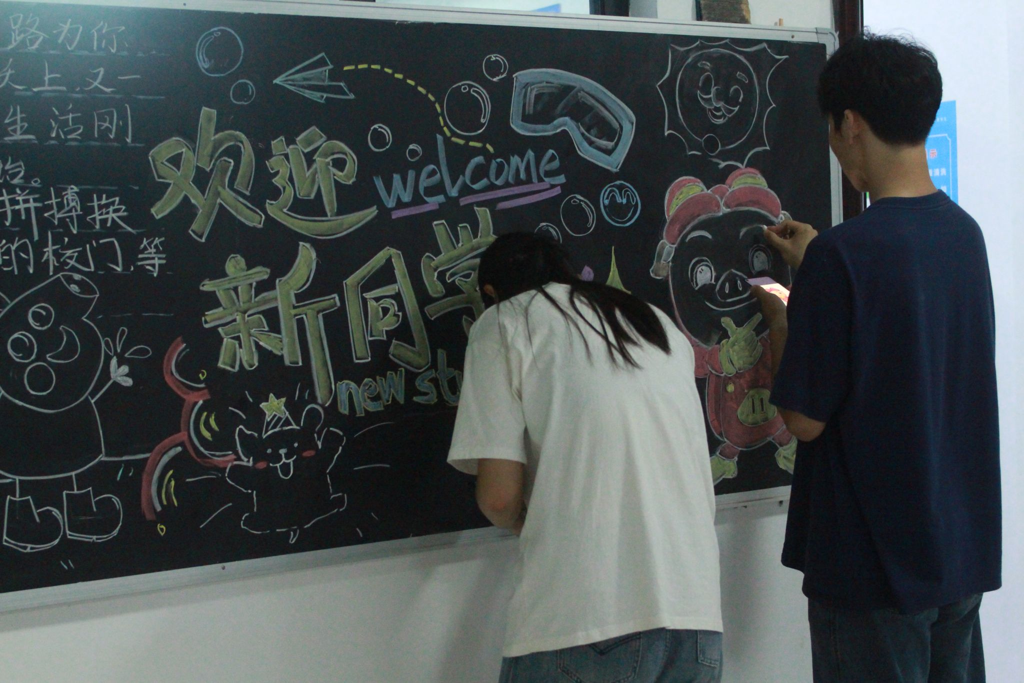 30余名志愿者在2、3、8、9、12、13、14、16号楼绘制迎新黑板报,色彩丰富的黑板报吸引了不少学生驻足围观。