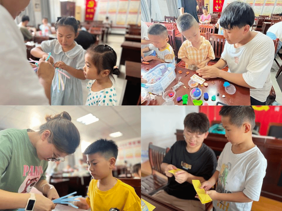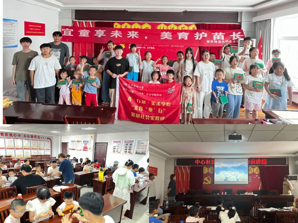 青•行知“美育‘童’行”暑期社会实践团前往安庆市宜秀区大龙山镇中心社区开展了暑期“三下乡”社会实践活动,团队成员立足学科专业特色,将红色文化与艺术相结合,开设系列暑期艺术课堂,带领社区近30余名儿童感悟艺术魅力,传承红色基因和优秀传统文化。
