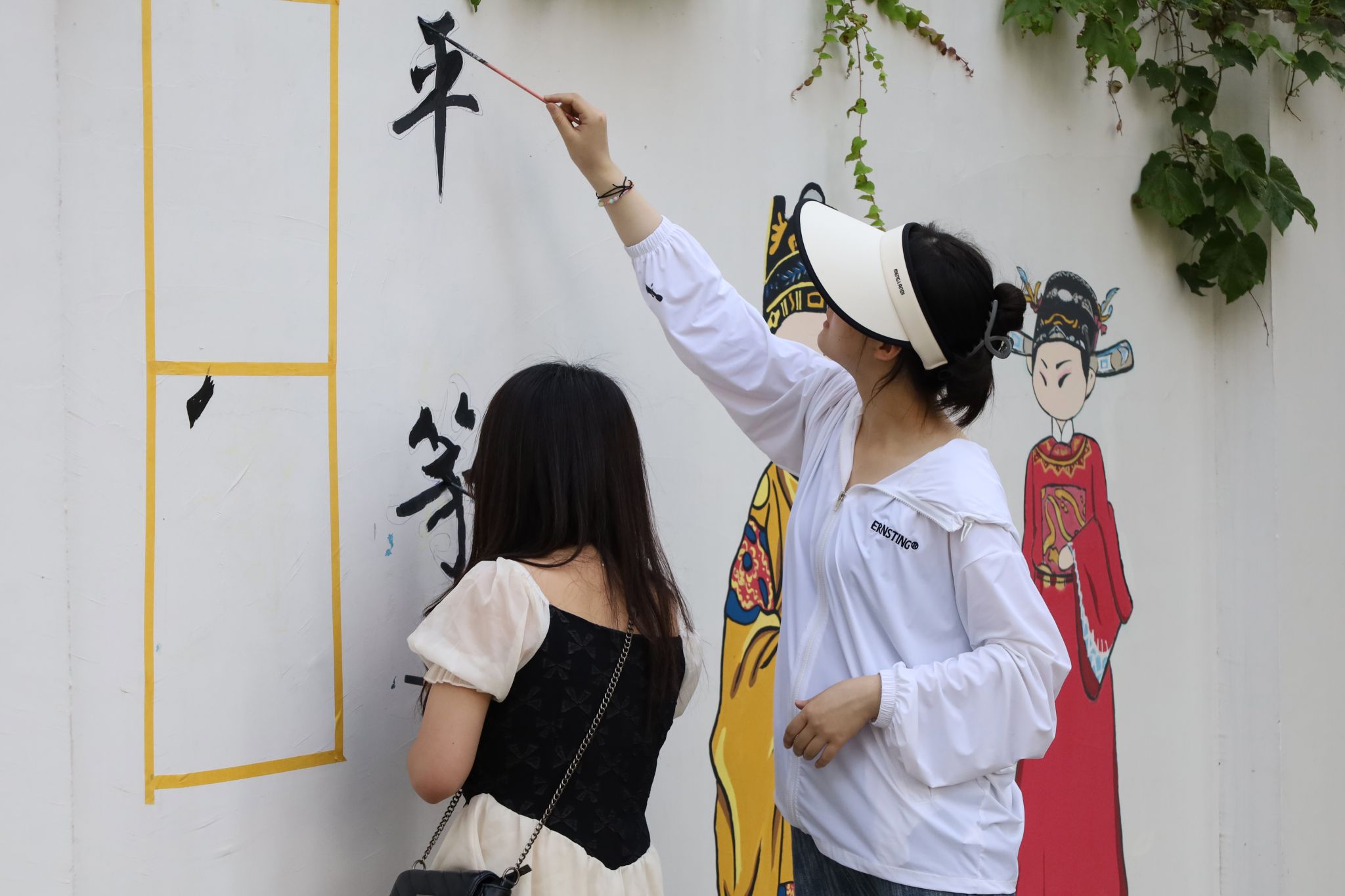 美术学专业2022(1)班的李欣雨身为黄梅戏“忠实爱好者”,致力于打造一幅画工精美的“女驸马”墙绘作品。“我从小就喜欢听黄梅戏,它委婉优美的曲调、通俗风趣的语言简直让我‘上瘾’。”经过小组成员们对戏曲人物神态、服装细节的不断打磨,一个身着红袍、头戴纱帽的女驸马跃然“墙”上。