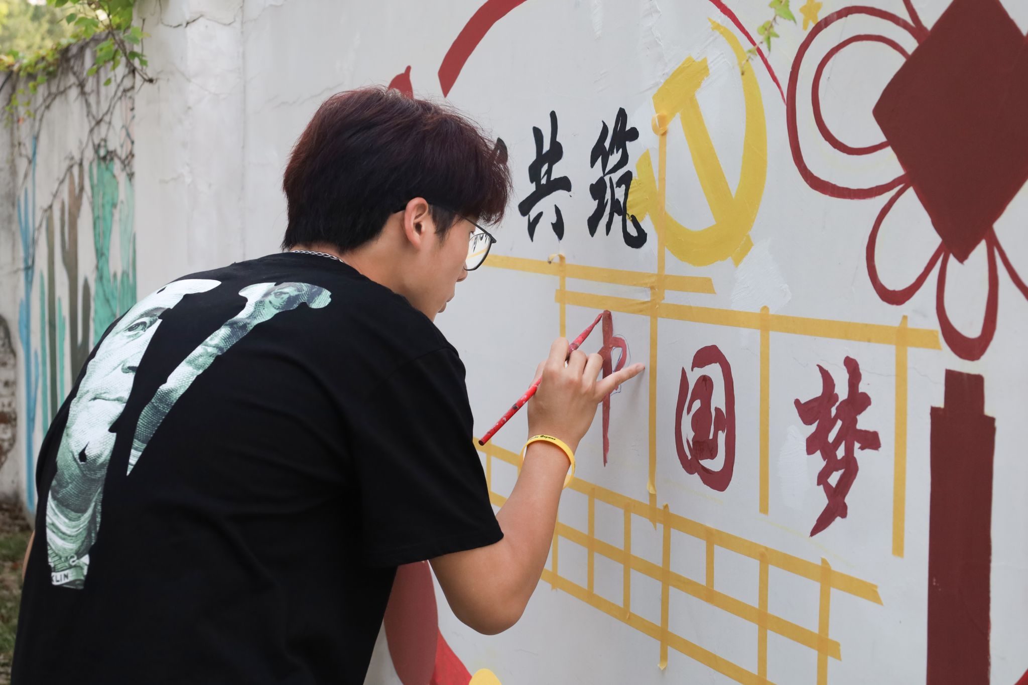 以“社会主义核心价值观”为主题,海鸥与中国结作点缀,绘制出金黄色的锤子和镰刀,构成中国共产党党徽。在美术学专业2022(3)班的林婷婷的精心设计下,一幅名为“同心共筑中国梦”的墙绘作品就此“诞生”。“很开心有机会为校园文化建设出一份力。”作为入党积极分子,林婷婷表示,希望通过特色墙绘,将爱国理念传递给更多人。