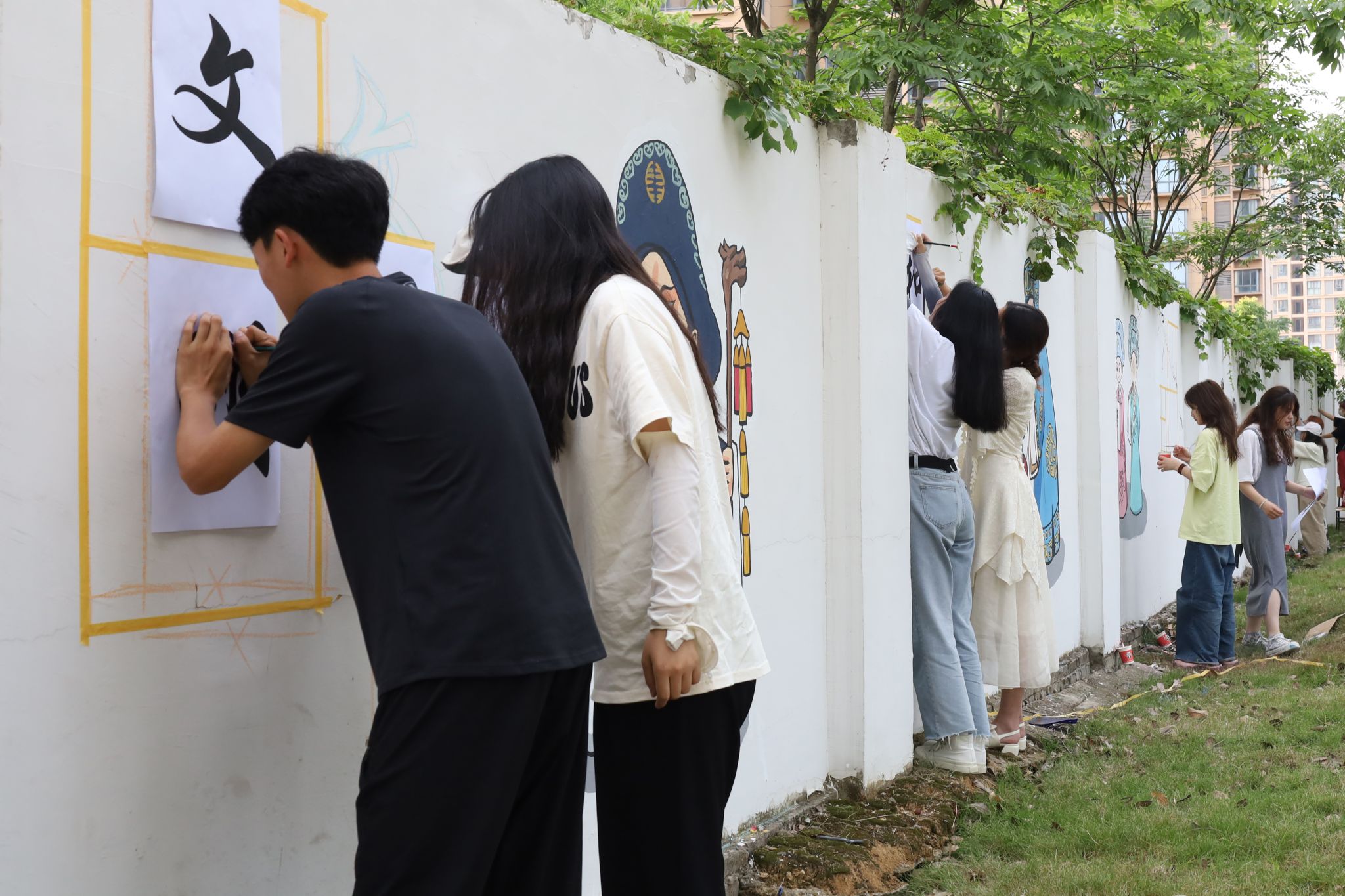 据活动负责人、美术学专业2021(3)班的冯海洲介绍,墙绘以“社会主义核心价值观与中国戏曲文化”为主题,共覆盖墙面200余平方米,耗时一个星期完成。“学生们利用专业知识,结合安庆特色文化,以笔墨传情,绘画传意,绘制出心中的‘家国情’。”冯海洲说。