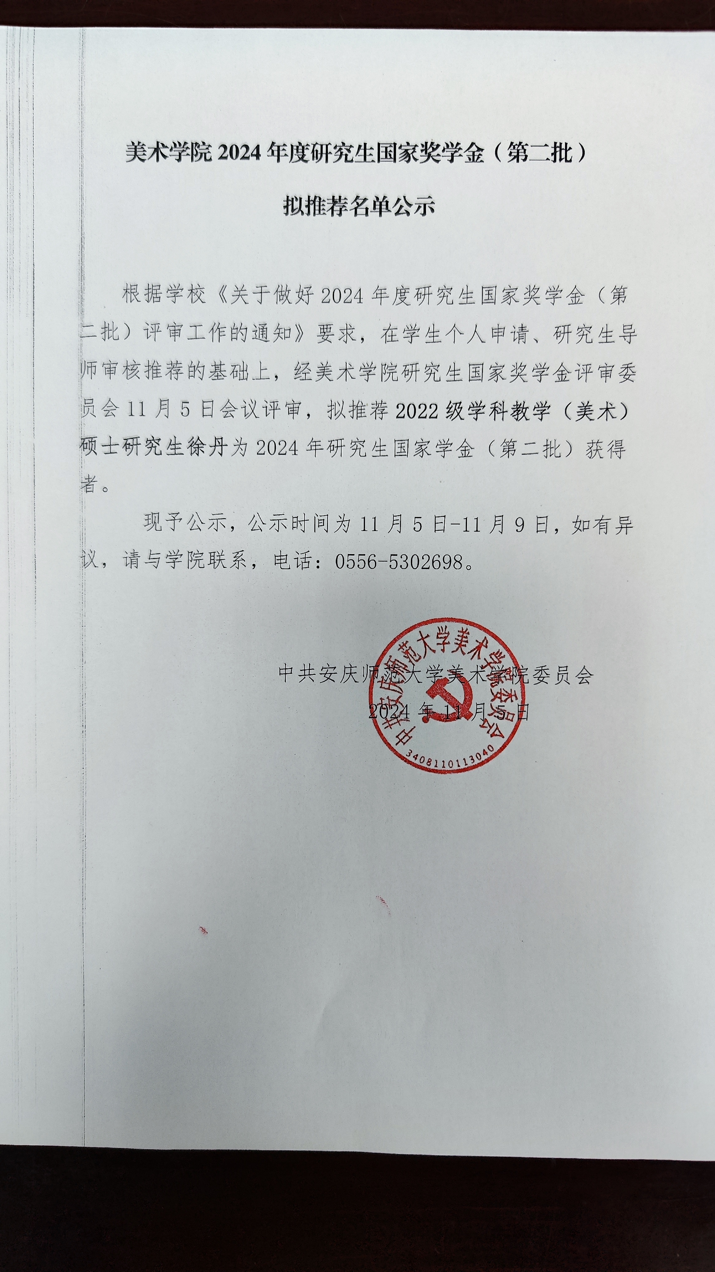根据学校《关于做好2024年度研究生国家奖学金(第二批)评审工作的通知》要求,在学生个人申请、研究生导师审核推荐的基础上,经色情导航 研究生国家奖学金评审委员会11月5日会议评审,拟推荐2022级学科教学(美术)硕士研究生徐丹为2024年研究生国家学金(第二批)获得者。