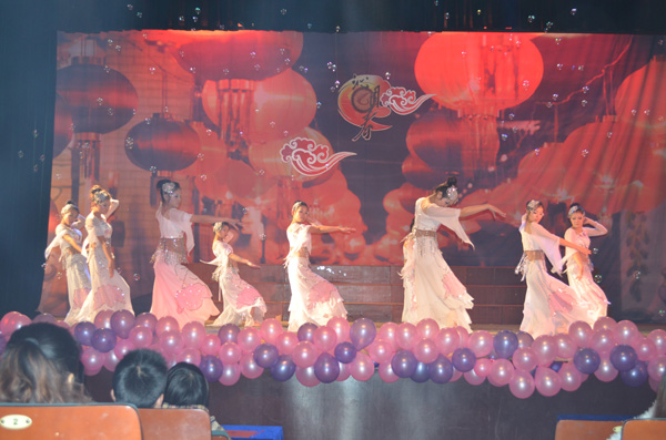 伴随着动感的开场舞《江南style》,晚会正式拉开了序幕。恢弘大气的诗朗诵《沁园春·雪》登上舞台,节目采用了一人朗诵两人进行书法表演的形式,不仅完美的契合了晚会的主题,更是展现了美院学生的专业特色。未见人,先闻声,在一阵叮咚的流水声后,灯光乍现,由夏艳等同学带来的舞蹈《嬉水》带给观众惊艳的视听感受,而cosplay真人秀表演更是引得动漫迷们尖叫连连,现场的掌声和欢笑不断,将晚会推向了第一个高潮。《change》、《肚皮舞》和《机械舞》3支各具特色的舞蹈闪亮登场,演员们高难度的技巧动作,丰富的肢体语言表达,令现场同学们赞叹不已。歌曲《因为爱情》男女深情对唱,更是让观众心中涌起一阵阵暖流。唯美的舞蹈《画中仙》,让现场观众们如临仙境,更是体现出美院学子的多才多艺与青春活力。小品表演《飞机场的那点事》将本次晚会推向了第二个高潮,演员们夸张的肢体动作与丰富的表情,逗得现场观众放声大笑。具有浓郁安庆特色的黄梅戏《到底人间欢乐多》,让大家充分感受黄梅戏的魅力和风采。 “在世界的国,在天地的家,有了强的国,才有富的家……”手语表演《国家》让广大同学们体会到了美院这一大家庭的温暖,歌颂了对祖国的无限热爱,同时也唱出了广大同学对党的十八大所描绘的美好生活蓝图的期盼。晚会结束后,出席晚会的领导、老师和嘉宾上台与全体演职人员合影留念。