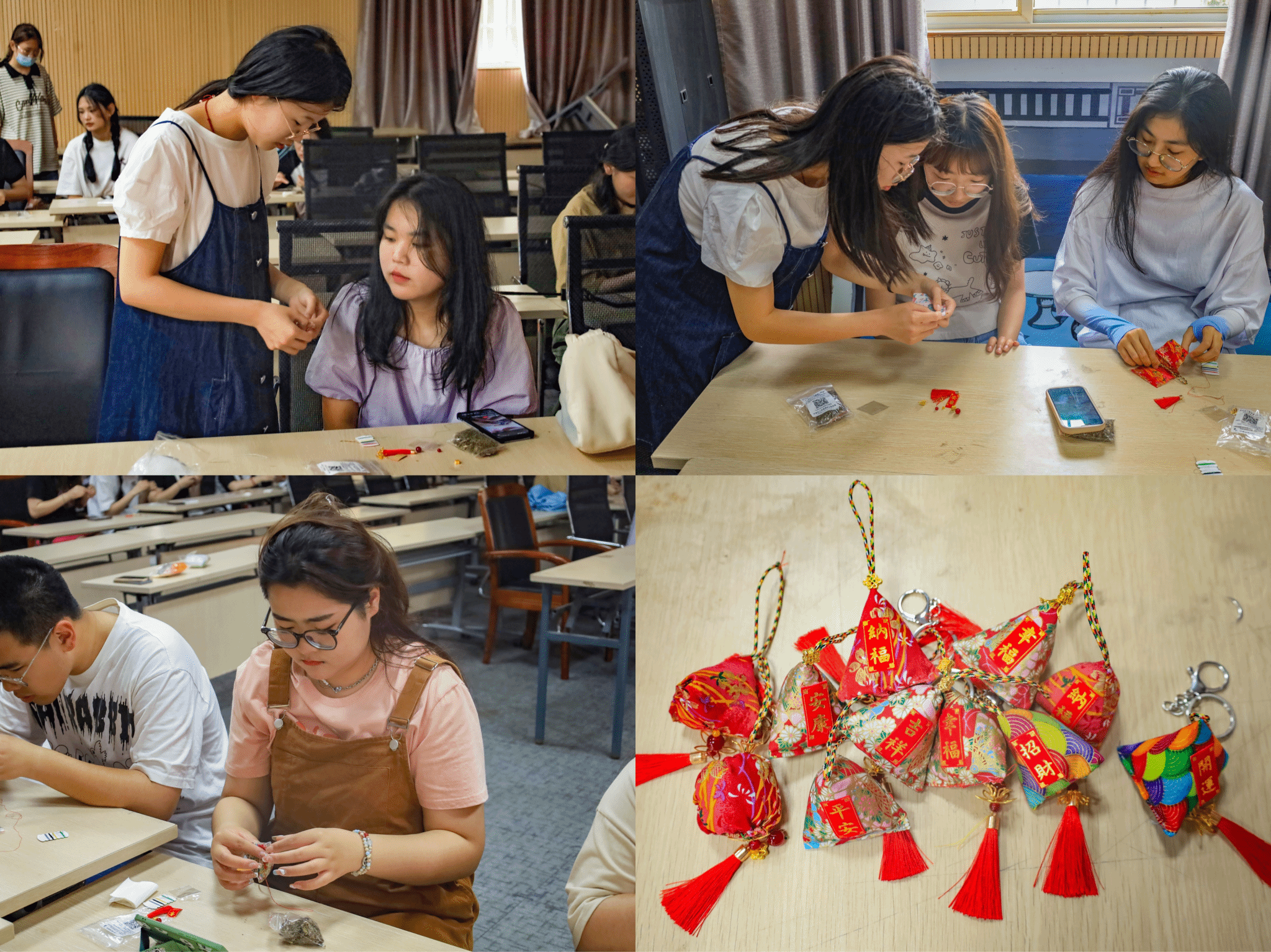 于学院学术报告厅开展“感念慈母恩 妙手巧生花”活动。50余名学生手拿针线,精心挑选香料,用巧手制作香包、钥匙扣,为母亲送上“专属”节日礼物。