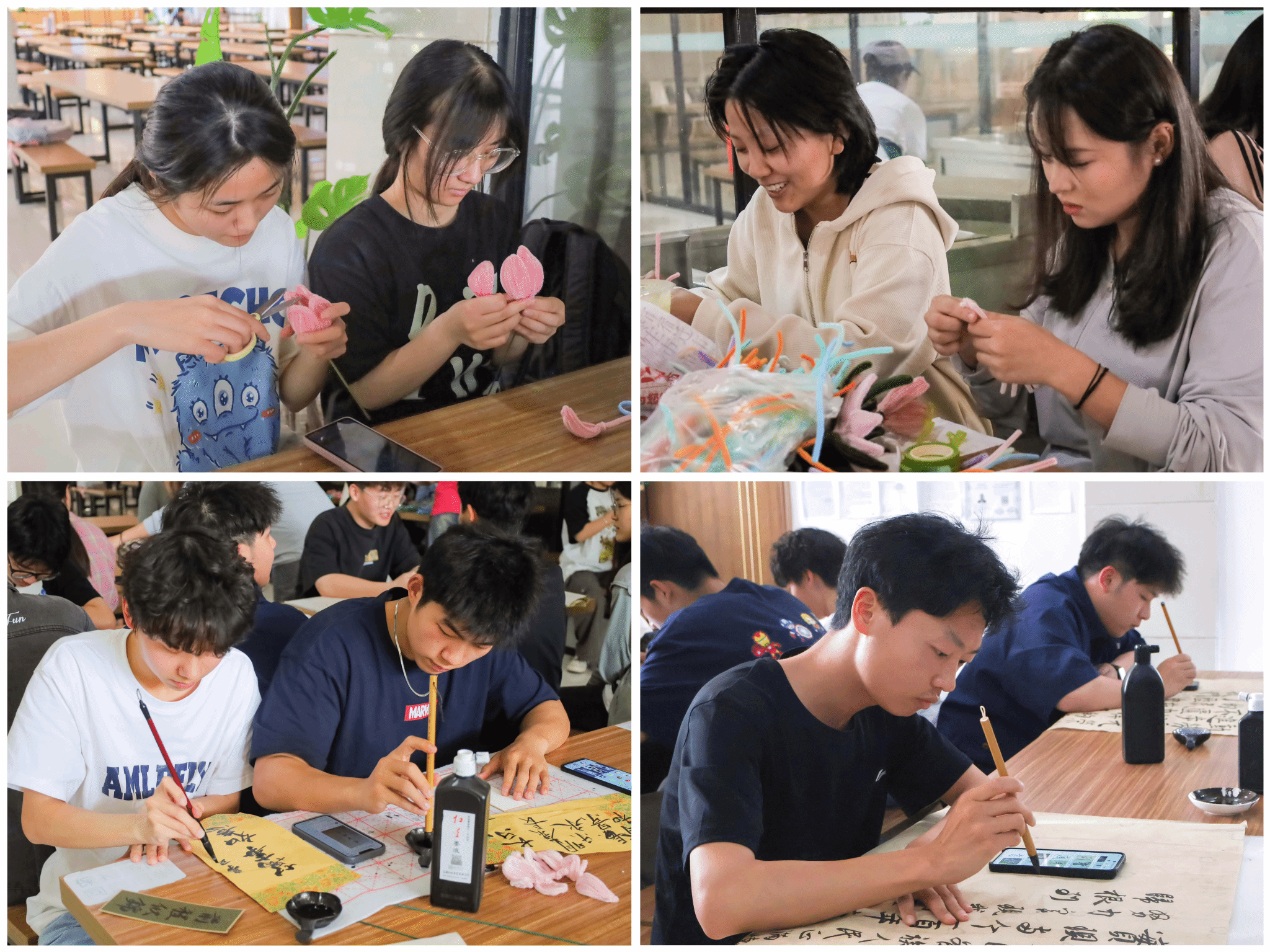 提笔蘸墨、落笔有神。另一边,学院书法俱乐部的成员正在准备赠送给食堂全体工作人员的两幅书法作品。随着一行行毛笔字在宣纸上铺陈开来,两幅誊抄着赞扬中国人民凭借劳动创造精神兴盛至今的伟大事迹的书法作品惊艳亮相,遒劲有力的字体赢得了食堂来往工作人员的“点赞”。