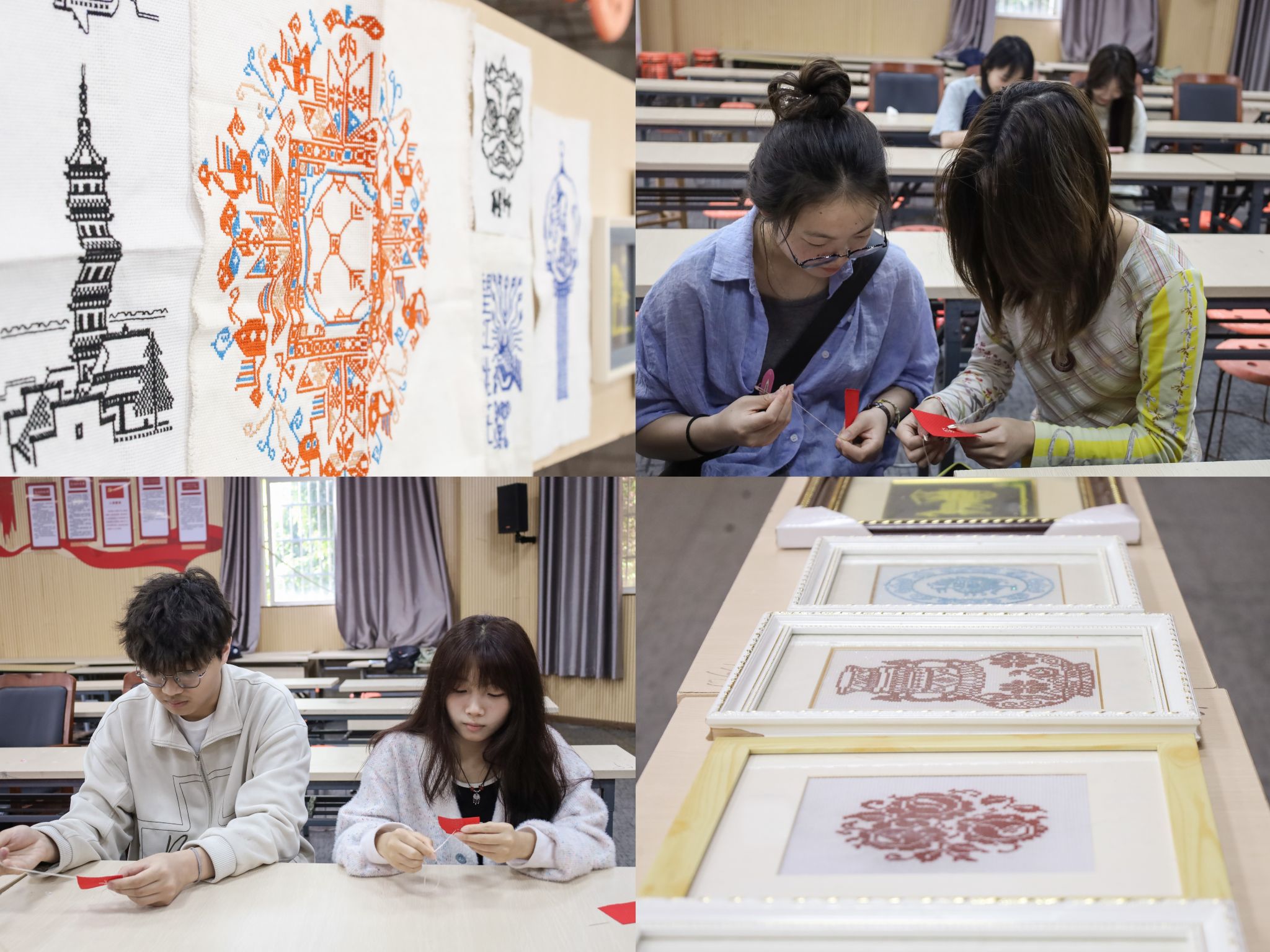 为充分展示望江挑花的魅力,活动现场特意布置了精美的展览区,参与学生能够欣赏往届学子绣制的作品。花鸟鱼虫、人物山水无不栩栩如生,色彩运用大胆细腻,红、黄、蓝、绿各色交织,形成强烈的视觉冲击。“一开始,我只是被这些色彩鲜艳、图案精美的挑花作品所吸引。”设计学类专业2023(3)班的聂雯青感叹,当她开始尝试制作时,便深深被这种传统工艺的精细和复杂所感染。