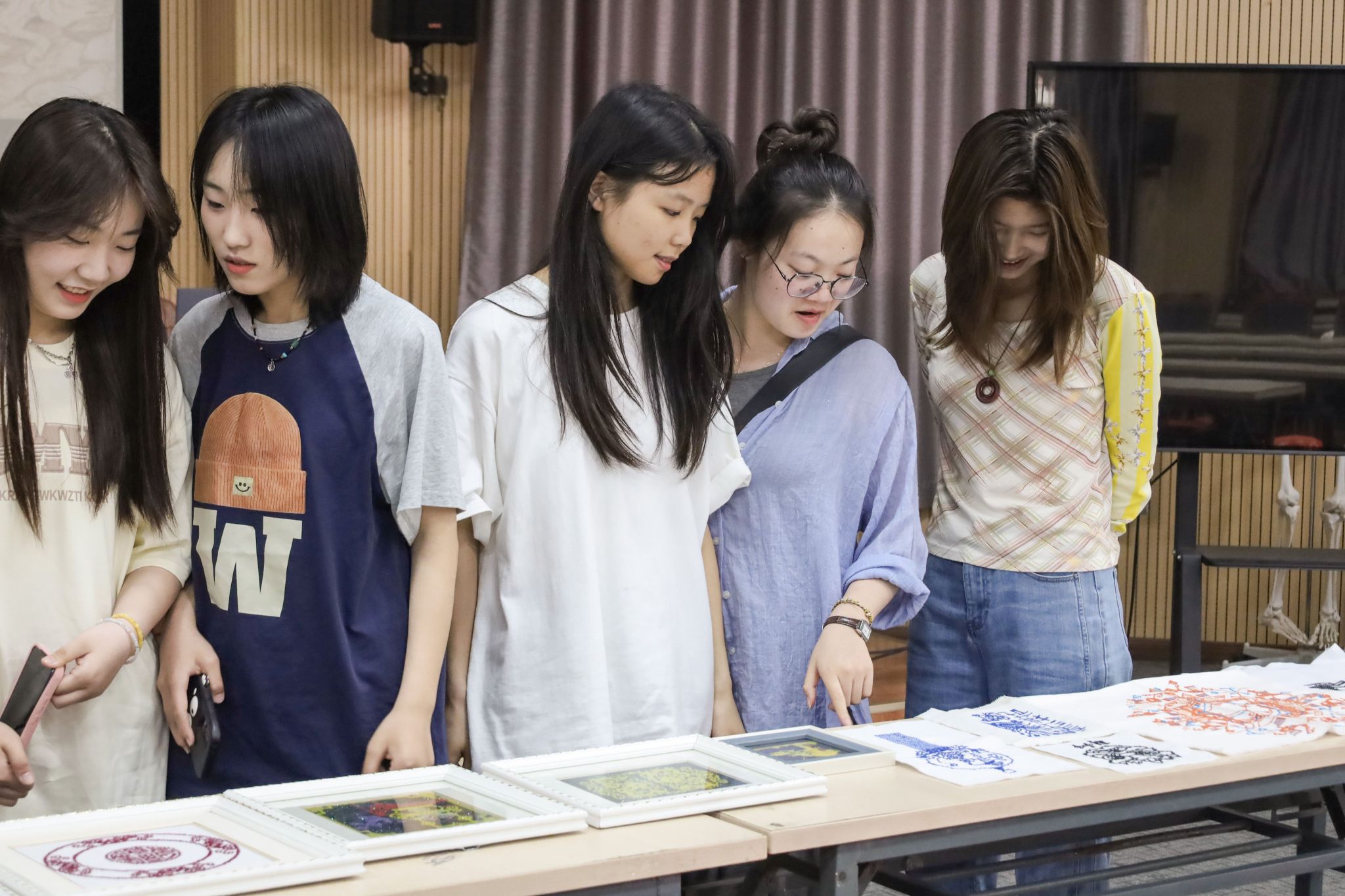 绣布、绣线、绣针一切准备就绪,体验区拉近了现场学生与非遗文化之间的距离。随着时间的流逝,参与活动的学生们仅凭一根针、一绺线,在青与白、蓝与白的搭配中专注地进行着收尾工作。他们互相讨论绣法,交流心得,与好友分享体验挑花的喜悦。