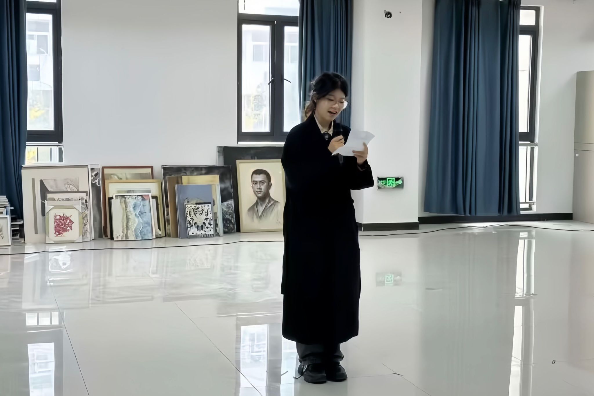 “这就是我的中华,五千年的史诗随你妙笔生花;这就是我的中华,新时代的画卷任你挥洒勾画——” 美术学专业2023(3)班的叶子怡和曹雨婷声调抑扬顿挫、饱含深情,描绘了从盛世大唐到新时代中国的历史画卷,歌颂历史的悠远壮阔。给朗诵词分段、标记重点符号、寻找配乐……两位朗读者从接到通知起便开始准备此次朗诵。叶子怡表示,初高中时自己便经常参与表演活动,今后将继续积极参演学院举办的各类文艺类活动。